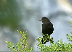 The Tibetan blackbird (Turdus maximus) is a species of bird in the thrush family Turdidae. It is found in the Himalayas from northern Pakistan to southeastern Tibet. Originally described as a separate species by Henry Seebohm in 1881, it was then considered a subspecies of the common blackbird until 2008, when phylogenetic evidence revealed that it was only distantly related to the latter species. It is a relatively large thrush, having an overall length of 23–28 centimetres (9–10 inches). Males are blackish-brown all over with darker plumage on the head, breast, wings and tail and dull orange-yellow bills, while females have browner underparts, faint streaking on the throat, and a dull darkish yellow bill. Both sexes may seem slightly hooded. It can be differentiated from the common blackbird by its complete lack of an eye-ring and reduced song.