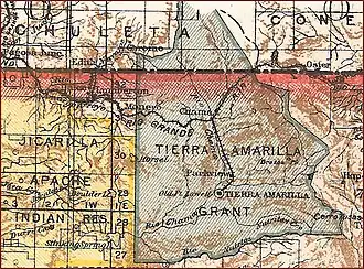 The Tierra Amarilla ("Yellow Land" in Spanish) Land Grant is about 40 mi (64 km) from north to south and 25 mi (40 km) east to west, occupying a large portion of Rio Arriba County, New Mexico and a small portion of Archuleta County Colorado. The land begins at the Rio Nutrias in the south and extends northward to the south San Juan Mountains of Colorado. Most of the land is mountainous. The lower elevations are semi-arid and vegetation is grassland and Pinyon pine woodland. Conifer forests are found at higher elevations. Elevations on the grant range from 6,653 ft (2,028 m)[4] at the junction of the Nutrias with the Rio Chama in the south to 12,778 ft (3,895 m) at Banded Peak in Colorado.[5] Two small towns are in the grant area: Tierra Amarilla (population 297 in 2020) and Chama (population 917). Chromo is a community at the edge of the grant in Colorado.[6][7] The former town of El Vado, which in 1910 had a population of 1,000, is now beneath the waters of El Vado Lake.[8]