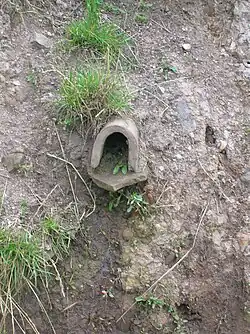 In a tile drainage system, a sort of "plumbing" is installed below the surface of agricultural fields, effectively consisting of a network of below-ground pipes that allow subsurface water to move out from between soil particles and into the tile line. Water flowing through tile lines is often ultimately deposited into surface water points—lakes, streams, and rivers—located at a lower elevation than the source. Water enters the tile line either via the gaps between tile sections, in the case of older tile designs, or through small perforations in modern plastic tile.[9] The installation of the tiles or tile line can involve a trencher (Ditch Witch), a mole plough, a backhoe, or other heavy equipment.