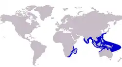 The tille trevally is distributed through the tropical and subtropical waters of the Indian and west Pacific Oceans.[7] In the western part of its range, the species distributed throughout South Africa and Madagascar waters north along the east African coast up to Tanzania, with an apparent break in its range from Tanzania to India. Its range continues from India east to South East Asia and the Indonesian Archipelago. The distribution extends south to northern Australia, north to Japan, and to Fiji in the east.[2]