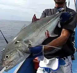 The tille trevally is a large species, growing to a maximum known length of 80 cm and a recorded weight of 7.3 kg.[2] It is similar in general appearance to most jacks in the genus, having a compressed, oblong body, with the dorsal profile more convex than the ventral profile, particularly anteriorly. This curvature gives the fish a discernibly 'blunt' head and steep snout, which is the most obvious identifying feature of the species.[7] The dorsal fin is in two distinct sections; the first consists of eight spine and the second of one spine and 20 to 22 soft rays. The anal fin consists of two anteriorly detached spines followed by one spine and 16 to 18 soft rays,[8] while the pelvic fins have one spine followed by 18 soft rays. The lateral line is moderately arched anteriorly, with 53 to 54 scales in this section, while the straight section contains none to two scales and 33 to 42 strong scutes. The breast is completely scaled.[9] The species has well-developed adipose eyelids, while its dentition consists of an outer row of widely spaced canines and an inner band of villiform teeth in the upper jaw, with a row of widely spaced conical teeth on the lower jaw. The tille trevally has 22 to 25 gill rakers and 24 vertebrae.[7]