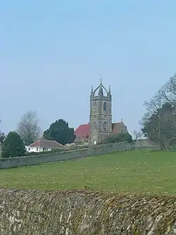 Upperton and Tillington are designated Conservation Areas. There are many old dwellings, including medieval timber-framed houses, with one third of the buildings in the parish being grade II listed.[3] Pitshill is a Georgian mansion standing at the head of a valley between Upperton and River. All Hallows Church with its unusual Scots crown tower is a landmark when approaching from Petworth, and is floodlit at night.[4] It was painted by J. M. W. Turner and John Constable. The church, first recorded in 1100 was mostly rebuilt and enlarged between 1807 and 1837, but retains romanesque sculpture and a plain eight-sided twelfth century stone font.[5][6][7]
