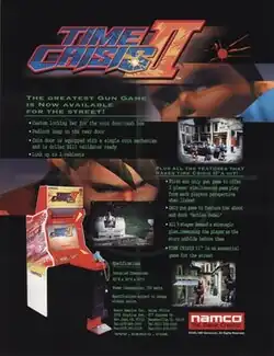 Time Crisis II is a 1997 light-gun shooter video game developed and published by Namco for arcades. It is the second installment in the Time Crisis series. The game incorporates the same mechanics of its predecessor, with some minor changes, but with the addition of co-operative two-player gaming. The game's story focuses on the efforts of two secret agents, Keith Martin and Robert Baxter, as they attempt to thwart the efforts of an industry mogul's plan for world dominance.