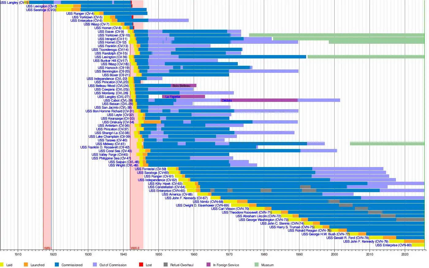 This is a bar graph showing a timeline of aircraft carriers of the United States Navy displaying the ships' names and their hull numbers.