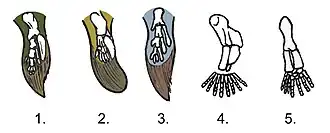 Illustration showing how much the hindlimb attachments in lobe-finned fishes need to change in transitioning from lobe-finned fishes (A) to early tetrapods (B) if the fish was to become a terrestrial animal. Comparison between the fins of lobe-finned fishes and the legs of early tetrapods: 1. Tiktaalik 2. Panderichthys 3. Eusthenopteron 4. Acanthostega 5. Ichthyostega (hindleg) |
