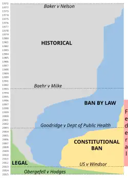 History of same-sex marriage legal status, 1971-2015, with influential legal decisions. Plot shows proportion of US states and the District of Columbia with: historical/traditional definition of marriage (gray); legislation enacted to ban same-sex marriage (blue); constitutional bans on same-sex marriage (yellow, includes states that also have legislative ban); statewide legal same-sex marriage (green). Red bar shows period in which DOMA prohibited federal recognition of same-sex marriages.[7]