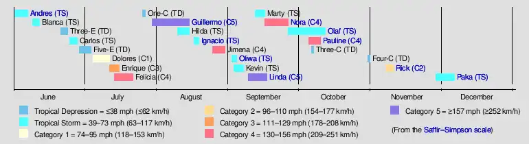 Typhoon PakaHurricane Rick (1997)Hurricane PaulineTropical Storm Olaf (1997)Hurricane Nora (1997)Hurricane Linda (1997)Typhoon OliwaTropical Storm Ignacio (1997)Hurricane Guillermo (1997)Tropical Storm Andres (1997)Saffir–Simpson scale