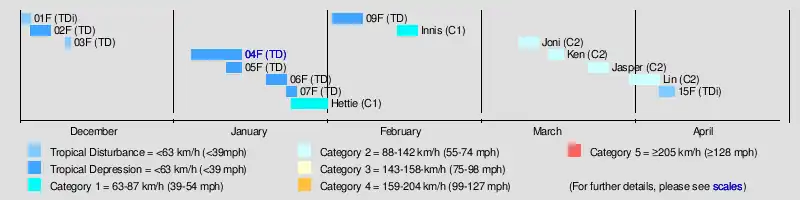 For the fourth season in a row tropical cyclone activity in the South Pacific was below its climatological average of nine tropical cyclones, with only six tropical cyclones occurring within the region. The most damaging tropical disturbance was Tropical Depression 04F which also was the deadliest tropical disturbance occurring during the season. The depression caused $45 million (2009 USD; $66 million 2025 USD) in damage and killed twelve people when it caused the worst economic natural disaster in Viti Levu since the drought of 1998.[1]
