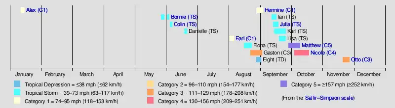 Hurricane OttoHurricane Nicole (2016)Hurricane MatthewTropical Storm Julia (2016)Hurricane HermineHurricane Earl (2016)Tropical Storm Colin (2016)Tropical Storm Bonnie (2016)Hurricane Alex (2016)Saffir–Simpson scale