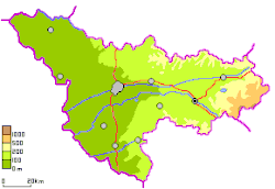 The plain penetrates in a gulf-like manner the hilly areas, on the valleys of Timiș (towards Lugoj) and Bega (towards Făget).[9] In the east of the county lie the pre-mountain hills of Buziaș and the southern sector of the Lipova Plateau, whose peaks rise to altitudes between 200 and 400 m. The hills of Lăpugiu, Făget, Lugoj, Lipova, Silagiu and Sacoș are rich in pastures, orchards of fruit trees, vineyards, but also in cereal crops. The relief in the eastern part of the county is dominated by the Poiana Ruscă Mountains, with deep valleys and steep slopes, with heights that rarely exceed 1300 m (Padeș peak – 1374 m, Rusca peak – 1355 m).[10]: 8–9