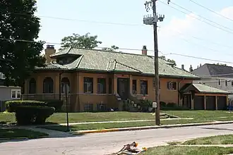 The Timothy J. Lynch House is a historic house at 416 N. 4th Avenue in Maywood, Illinois. The house, a large Chicago bungalow, was built in 1927. While thousands of bungalows were built in the Chicago area in the 1920s, including many others in Maywood, the Lynch House is unusual both for its size and its level of ornamentation. The house's design includes a main entrance with arched sidelights, round arched windows in a large front bay, patterned stained glass window panels, and a green tile roof. Like many Chicago bungalows, the design features several elements of Prairie School architecture, such as the geometric designs in its stained glass windows, overhanging eaves, and wood trim on every door and window.[2]