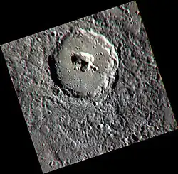To Ngoc Van is a pit-floored crater on Mercury, named after the Vietnamese artist Tô Ngọc Vân.[1] It was discovered in January 2008 during the first flyby of the planet by MESSENGER spacecraft.[2] Its floor displays an irregularly shaped collapse feature, which is called a central pit. The size of the pit is 21 × 10 km.[2] Such a feature may have resulted from collapse of a magma chamber underlying the central part of the crater. The collapse feature is an analog of Earth's volcanic calderas.[2] The pit may be evidence of explosive volcanism on the floor of the crater.[3]