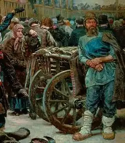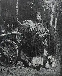 Another important figure is the peasant standing by the cart on the right-hand side of the canvas. Savitsky picks him out of the crowd of people bidding him farewell. His face, pose and movements convey strength and confidence.[39] The peasant's clothes - a patched shirt, trousers, puttee and bast shoes - testify to his poverty. His figure is in the background, so that he can observe the farewell scene of the conscripts and their relatives in the foreground.[40] The fact that he does not say goodbye to anyone suggests that his relatives are not among the soldiers going off to war - apparently he has just taken someone he knows with him on a cart.[39] Obviously, he has seen a lot in his life, so he understands the essence of what is happening better than others - hence, according to Elena Levenfish's description, the "hatred in his sullen gaze, a maturing protest." Savitsky's contemporaries emphasised this character, calling him a "ploughman-athlete", a "mighty worker" and a "black soil strength".[40] His image was later compared to two figures in Kramsky's paintings of the Peasant Cycle - Forester[33] and Meditator.[40] According to the art historian Mikhail Sokolnikov, the figure of the peasant forms a kind of centre in the right-hand part of the composition, and his "gigantic image breathes such power and strength, is so plastically expressive that the viewer feels in him a symbol of the people awakening to consciousness and the unbending will of the people".[41] A similar image of the peasant was also present in the 1880 version, albeit with the addition of a weeping peasant woman next to him, covering her face with her hands and leaning against the edge of the cart[40] (fragment Crying Peasant Woman and Peasant Man at the Cart, private collection).[11] In contrast to the final version, in the initial version the group with the cart was situated in the foreground on the left side of the painting.[40]