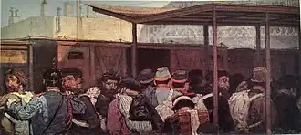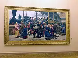 In his work, Savitsky depicts the events of the Russo-Turkish War of 1877-1878.[27][16] The painting, which is a multi-figure composition, does not depict military action but instead portrays the grief of relatives and friends as they bid farewell to soldiers – reserve conscripts – who are going off to war.[33][34] By opting to portray the last minutes before the separation, the artist was able to "show the actors at a time when all the feelings and thoughts, usually hidden from view, are more vividly manifested".[35] The canvas depicts the various stages of this event. On the right-hand side, the background depicts a dense crowd, with individual figures merging into one another. The central section of the painting, which features multiple groups painted in detail, depicts the most intense moments of the action. In the background, at the rear of the composition, the soldiers who have already bidden their relatives farewell are climbing the platform, attempting to, for the final time, catch the gaze of those who have come to see them off.[33]