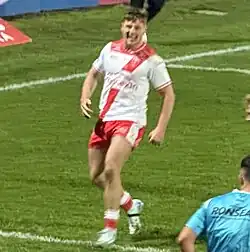 On 25 June 2021 he made a try-scoring début for England in their 24-26 defeat to the Combined Nations All Stars, staged at the Halliwell Jones Stadium, Warrington, as part of England’s 2021 Rugby League World Cup preparation.[17]