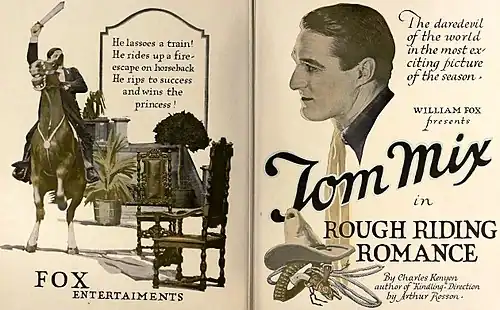 In 1917 Mix left Selig and signed a contract with the Fox Film Corporation.[8] His earliest films for them were two-reel shorts but within a year he switched to features. During his peak period in the 1920s Mix appeared in action-packed westerns filled with fights and chases which often showed him doing his own stunt work.[9] His films were also known for their location work in places such as Arizona's Grand Canyon and Colorado's Royal Gorge.[10] Among the notable directors that he worked with during this time were John Ford, Sidney Franklin, Jack Conway, George Marshall, and Roy William Neill.[9] His leading ladies included Louella Maxam, Colleen Moore, Esther Ralston, Laura La Plante, Billie Dove and Clara Bow.[11] In 1928, after eleven years and 86 films with Fox, Mix moved to FBO Pictures for a series of five films.[12] With the advent of sound, Mix abandoned his film career and returned to working in Wild West shows. He came back to films in 1932 for a series of nine sound features for Universal.[13] In 1935, he appeared in his final film, a 15-chapter serial for Mascot Pictures. Mix died in an automobile accident in Arizona five years later.[14]