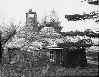 The building was built in 1929 to a design by New York City architect Alfredo S.G. Taylor. Taylor spent many summers in Norfolk, and is credited with more than thirty commissions in the community. A number of them share the medieval features used in this building: the rough rustic stone and wood finishes, and heavy slate roof. Details of the building were published in American Architect and Building News after its construction. Taylor's work for the Childs family also included the Starling Childs Camp on Doolittle Lake, and the Childs Sports Building; the latter in particular, located north of Windrow Road, has similar style and construction methods to this building, but on a larger scale.[2][3] This house was referred to by the family as the "Teahouse"; its "Tom Thumb" name was applied in the American Architect and Building News article.[2]