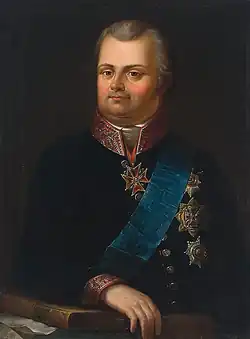 In March 1813, a Temporary Council for a new government in the Russian-conquered Duchy of Warsaw was created.[11] It consisted of Tomasz Wawrzecki, Adam Jerzy Czartoryski, Nikolay Novosiltsev and Franciszek Ksawery Drucki-Lubecki.[11] Wawrzecki was the chairman of the Commission of Justice of the Duchy of Warsaw in 1813–15.[1] On 20 June 1815, when the Kingdom of Poland was re-created as a Russian puppet state, Wawrzecki delivered a speech praising Tsar Alexander I of Russia and Grand Duke Konstantin Pavlovich of Russia.[12] Wawrzecki was the Justice minister of the Kingdom of Poland in 1815–16 and proposed that the Lithuanian Statutes should be the new law in the Kingdom of Poland, as he thought that the Lithuanian Statutes were better than the Napoleonic Code.[11] Wawrzecki was part of conservative Lithuanian nobility that opposed keeping of the Napoleonic Code within Congress Poland.[13] He died on 5 August 1816 in Vidzy, then part of the Russian Empire's Lithuania-Vilnius Governorate, but now in Belarus.[1]