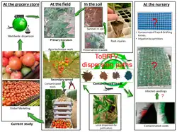 Tomato brown rugose fruit virus can be transmitted mechanically - the virus is stable outside of the plant and so can spread between plants on contaminated tools, clothes or hands.[31] Seed transmission is suspected but has not yet been verified,[32] though it has been detected on tomato seed moving in trade.[24] The virus can also spread via plant propagation.[31] It has been inferred that mechanical transmission from the seed coat to the growing plant may occur.[6]