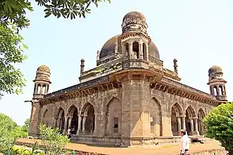 The tomb is a two-storied square structure with hexagonal minarets on all four corners. The tomb borrows elements from the Imperial style of the Delhi Sultanate, as well as the provincial style of the Deccan and Gujarat.[6] It is located in the midst of a garden.[2]