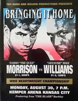 Tommy Morrison vs. Tim Tomashek, billed as Bringing It Home, was a professional boxing match contested on August 30, 1993, for the WBO heavyweight title.[1] Morrison's original opponent Mike Williams, who had appeared opposite Morrison in the film Rocky V, withdrew from the fight only 90 minutes before it was scheduled to take place. Rather than cancel the event, the promoters of the event selected journeyman Tim Tomashek as a last minute replacement.
