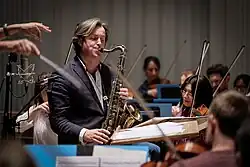 The next seven years were spent preparing for a much bigger orchestral work, the saxophone concerto Hiroshima (1998). This was premiered with the Orchestra of St. John Smith's Square at Chelmsford Cathedral and included strings, brass, woodwinds, percussion, piano, and saxophone. Smith appeared as solo saxophonist for Sally Beamish's The Knotgrass Elegy, commissioned for the 2001 BBC Proms, and performed with the BBC Symphony Orchestra at the Royal Albert Hall in London.[8] In 2002, Smith performed his earlier and much lengthier re-invention of Children's Songs for saxophone and orchestra with the Scottish Ensemble at St John's Kirk, Perth.[9] Other classical music endeavours have included a massive undertaking for the Edinburgh Youth Orchestra's 40th anniversary in 2003. A suite entitled Edinburgh was written for the occasion, with saxophone, bass, drums, and a one-hundred-person symphony orchestra. The work toured Scotland, Estonia, Russia, and Finland.