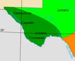 In the 1500s, the Tomoacas and Jumanos were main tribes in the area of western Texas that is now Big Bend Ranch State Park western Texas.[3][4][5] In 1583, early Spanish explorers (including Antonio de Espejo) encountered the Tomoacas at La Junta de los Ríos,[6] a regional hub of Indigenous settlement and agriculture.[7][8][9] Spanish chroniclers described the Tomoacas as wearing only well-tanned buffalo hides for clothing, and as skilled bow-and-arrow hunters of the buffalo.[8]