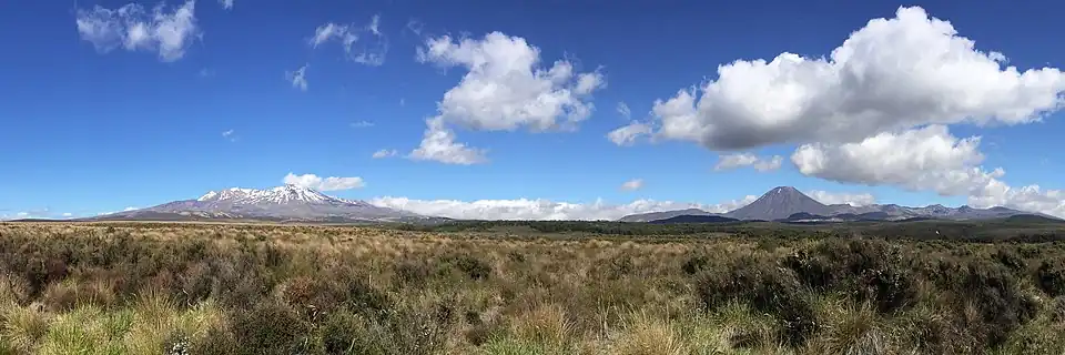 Panorama of Mount Ruapehu and Mount Ngauruhoe looking west from the Desert Road in January 2015