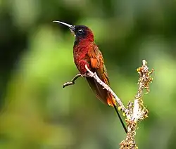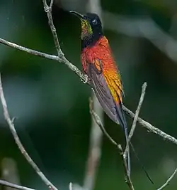 The topazes are two species of hummingbirds in the genus Topaza. They are found in humid forests in the Amazon Basin. Males are by far the largest hummingbirds in their range – the giant hummingbird of the Andes is the only larger species in the family. Males have a total length of about 22 cm (8+34 in), although this includes their elongated rectrices. They are colourful, being mainly strongly iridescent golden and crimson with a black hood and a green throat. Females lack the elongated rectrices and have a mainly green plumage.[1]