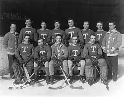 After the season, the team then played a series with the Victoria Aristocrats of the Pacific Coast Hockey League. A controversy erupted when a letter arrived from the Stanley Cup trustees on March 17, that the trustees would not let the Stanley Cup travel west, as they did not consider Victoria a proper challenger because they had not formally notified the trustees.[4] However, on March 18, Trustee William Foran stated that it was a misunderstanding. PCHA president Frank Patrick had not filed a challenge, because he had expected Emmett Quinn of the NHA to make all of the arrangements in his role as hockey commissioner, whereas the trustees thought they were being deliberately ignored. In any case, all arrangements had been ironed out and the Victoria challenge was accepted.[5][6] Nevertheless, the Torontos defeated Victoria in a best-of-five series played in Toronto in three straight games.