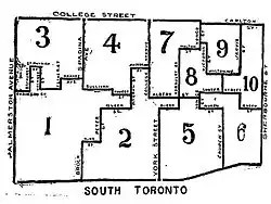 The riding was established in 1894. The boundaries were College Street and Carlton Street to the north, Sherbourne Street to the east and Palmerston Avenue to the west. It was bounded on the south by Lake Ontario.[1]
