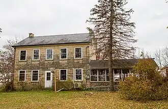 The Torrance House is a historic building located south of Lisbon, Iowa, United States. Cunningham and Margaret Torrance were natives of Lancaster County, Pennsylvania who settled in Franklin Township in 1847. The inscription stone in the east gable gives the date of this house as 1856. It was one of a few limestone buildings in Linn County even though the region has significant deposits of the stone.[2] The settlement-era dwelling incorporates both vernacular and classical influences in its construction. The vernacular elements include the asymmetry of the facades, and the coursed ashlar and random coursed ashlar stonework. The classical is primarily found in the stone belt courses above the second floor and gable windows on the east elevation, and above both rows of windows on the main facade. The house was listed on the National Register of Historic Places in 1983.[1]