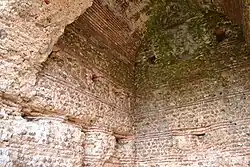 The fanum is an example of Roman architecture that is adapted to the resources of the site.[3] The walls are blockage clad with small sandstone or limestone rubble siding, alternating with beds of two to three rows of terracotta.[5] The walls reach 1.3 metres (4 ft 3 in) in thickness.[4] It is possible, though difficult to prove due to the façade's deterioration, that Tour de Grisset's masonry had geometric patterns made by arrangements of stones with different colors. This practice has been found elsewhere in the region, such as on the temple at Cherré[6] and the Roman city walls of Le Mans.
