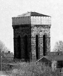 Tower Hill Water Tower is a disused water tower and local landmark in Ormskirk, Lancashire, England. Situated on the east side of Tower Hill, it was built between 1853–4 for Ormskirk Local Board of Health,[1] and is reputed to be the oldest remaining water tower in the country.[2] It was awarded Grade II* listed status in 1976,[1] and is on the Heritage at Risk Register.[3] The area immediately surrounding the tower has been used as allotments since the mid-20th century.[4]