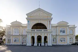Completed in the 1880s, the Town Hall is the city's oldest municipal building, as it once housed the Municipal Commission of George Town.[1] It also functioned as a venue for social events for the European elites.[2] However, its administrative function was taken over by the City Hall upon the latter's completion in 1903. The Town Hall has been gazetted by the Malaysian National Museum as a historic monument since 1993.[3] More recently, the building became one of the filming locations for the 1999 film, Anna and the King.[4]