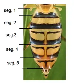 The abdomen is mostly black, with a yellow base and sides on the first segment. The second segment has a broad, entire yellow cross-band on the median. The female's third and fourth segments have a narrow yellow border at the front and a thin line passing through narrow interruptions of the broad yellow cross-bands. The fifth segment is yellow, except for two rectangular, parallel, and more or less connected black spots. The male's third and fourth segments are yellow or yellowish red, except for a pair of black lines on each side, resembling the sides of a square and being more or less indistinct. The fifth segment and the hypopygium are entirely yellow.[3][4][5]