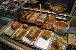 Today in France, a traiteur is a catering business devoted to take-out food and service of banquets. Many traiteurs also undertake home delivery. Generally there is no seating on the business premises; a few traiteurs may have very limited seating. Especially in market towns, where there is competition, traiteurs take great pride in the beauty of their window displays. Traiteur 'departments' are now common in supermarchés, the equivalent of the US/UK delicatessen. The staple of this type of business is an array of salads, cold meat and seafood dishes. In 2018, 10,090 traiteurs operated in France.[6]