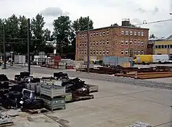 The SSB initially had a depot in Kniprodestraße at its disposal for operations. This went into operation together with the first line on July 1, 1908. The company leased the property with an area of 8671 square meters from the city. From 1908, there was initially a carriage and workshop hall with space for 45 vehicles on 3359 square meters, as well as a two-storey residential and service building, a two-storey storage shed and a gatehouse. By 1912, the facility had expanded to four halls for 120 vehicles. After the transition to the Berlin tramway, the depot was given the internal number 25. In 1923 the Berlin tramway closed the depot and continued to use it as a training workshop. The Berliner Verkehrsbetriebe in turn used the facility as a depot for work railcars and as a track construction yard.[2][25] The site now serves as a rail storage facility.