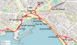 28. ^ Route map: Casino Municipal, Grand Hôtel, Le Paradou, Parc Façade, Vallieres und St Georges Port and Le Paradou, Parc Oasis, Rav de Belmont, Parc des Sports, Le Coca und St Georges de Didone