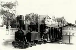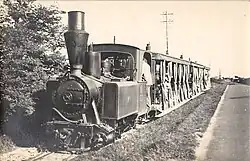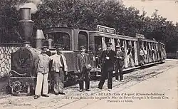 2. ^ The first batch of Campagne railcars had 24 seats, while the second batch only had 20 seats, albeit with upholstered seats. The sidecars were classic Decauville steam tramcars (Baladeuse, type "KE") with 56 seats (including 48 seats), in their original condition with minor adaptations. There were also short sidecars that the SGTR workshops had built themselves on the chassis of an old closed Decavuville carriage (type "IS"). The railcar pulling the inaugural train of the 600 mm forest railway had been re-gauged from metre gauge to 600 mm gauge in order to operate the re-gauged forest railway lines as an extension of the steam tramways.