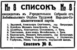In Transbaikal the local Bolshevik party organization had steered away from the party centre, and cooperated with the local Mensheviks and Socialist-Revolutionaries. In May 1917 the three parties had a joint list for the local government election. As of July 1917 Bolsheviks and Mensheviks were still holding joint meetings in Chita.[5] The city was ruled by a People's Soviet, gathering SRs (both right and left-wing factions), Mensheviks and Bolsheviks.[6] Only in the immediate run-up to the October Revolution was an All-Siberian Executive Bureau of the Bolshevik Party formed and the Siberian Bolsheviks began to conform with the party line.[5]