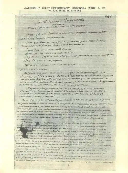 2. ^ Frank, V. S. (1947). "The Territorial Terms of the Sino-Russian Treaty of Nerchinsk, 1689". The Pacific Historical Review. 16 (3): 265–270. JSTOR 3635997. Cited: p. 269: "[...] it appears that according to the Latin text of the treaty (the only valid text!) [...]"