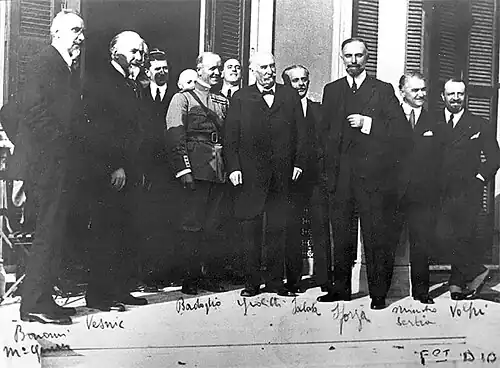 A delegation from the Kingdom of Serbs, Croats and Slovenes was dispatched to Santa Margherita Ligure, in Italy, for bilateral negotiations.[23] It was led by Vesnić, but the designated chief negotiatior was Trumbić. According to Svetozar Pribićević, this arrangement was made in Belgrade, in order to avoid the appearance that the Serbs were ceding to Italy territories inhabited by Croats and Slovenes. Therefore, Trumbić, as a Croat, would negotiate the treaty involving inevitable territorial concessions to Italy.[29] Sforza's most recent proposal was supported by the British and French, while the US remained silent on the matter, leaving Belgrade isolated.[25] In addition to Prime Minister Vesnić and Foreign Minister Trumbić, the ambassador of the Kingdom of Serbs, Croats and Slovenes to Rome Vojislav Antonijević was also among the principal members of that delegation. The principal members of the Italian negotiating team included Sforza, as well as Minister of War Ivanoe Bonomi and Giuseppe Volpi. Other members of the delegation included Marcello Roddolo, Francesco Salata, Alessandro Mattioli Pasqualini, and General Pietro Badoglio.[30] During the negotiations, Sforza demanded Istria and the Snežnik (Italian: Monte Nevoso), claiming their symbolic significance to Italy and stating that they would not be relinquished by the Italian army in any case. In return, he offered Italian friendship.[23] Negotiations took place between 9–11 November 1920, resulting in the treaty being signed on 12 November,[31] in the Villa Spinola. The treaty is named after the comune of Rapallo where the villa is located.[32] Italian Prime Minister Giovanni Giolitti came from Rome for the signing.[30]
