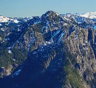 Treen Peak is a 5,765-foot (1,757-metre) mountain summit in King County of Washington state. It is located along the western edge of the Cascade Range and is set within the Alpine Lakes Wilderness, on land managed by Mount Baker-Snoqualmie National Forest. Precipitation runoff from the mountain drains into tributaries of the Snoqualmie River. Treen Peak is more notable for its large, steep rise above local terrain than for its absolute elevation. Topographic relief is significant as the summit rises over 4,150 feet (1,265 meters) above the Taylor River in 1.5 mile. The mountain's toponym was officially adopted on May 6, 1941, by the U.S. Board on Geographic Names to honor Lewis A. Treen (1885–1937), former Assistant Supervisor of Snoqualmie National Forest, who died on February 13, 1937.[3][5] The probable first ascent of the summit was not made until April 1974 by Jan Anthony, Joan Webber, and Mike Bialos.[4]