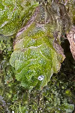 Treubia lacunosa is a species of liverwort in the family Treubiaceae that is found across New Zealand in moist shady areas on logs or soil. The organism is relatively complex for a liverwort, and hosts endosymbiotic fungi which provide it with growth-inhibiting nutrients.[1]