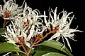 Flowers: Handsome flowers, nearly 4 cm in diameter, in loose axillary or terminal heads, are white tinged, becoming purple near the base, and closely resemble Hamamelis in shape. Petals are crinkly and long, to 2.5 cm, and at 4 cm in diameter are comparatively broad for this genus. Male and female parts are borne on separate flowers, either on the same specimen or different specimens (may be either monoecious or dioecious). Flowers from December to January.