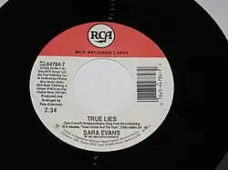 "True Lies" was released as Evans's debut single on March 10, 1997 via RCA Nashville. It was issued as a 7" vinyl single and included "The Week the River Raged" as the B-side.[6] The song spent six weeks on the Billboard Hot Country Songs chart and became a minor hit that year. It peaked at number 59 in the spring of 1997.[7] "True Lies" was later issued on Evans' debut studio album entitled Three Chords and the Truth. The song was the album's opening track.[8] "True Lies" would be one of three singles spawned from Three Chords and the Truth between 1997 and 1998. All three would only become minor country hits.[6] Evans recalled the reasoning behind why "True Lies" may have reached a lower end of the Billboard country music chart: "There were a lot of things that played into it that were out of my control. Radio saw me as just a little bit too retro."[9]
