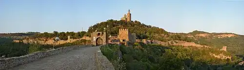 Tsarevets (Bulgarian: Царевец, romanizedTsarevets) is a medieval stronghold located on a hill with the same name in Veliko Tarnovo in northern Bulgaria. Tsarevets is 206 metres (676 ft) above sea level.[1] It served as the Second Bulgarian Empire's primary fortress and strongest bulwark between 1185 and 1393, housing the royal and the patriarchal palaces, and it is also a popular tourist attraction.[2]