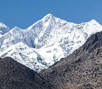 Tukuche Peak is a 6,920-metre (22,703-foot) glaciated summit in the Nepalese Himalayas. It is situated 8.4 kilometres (5.2 mi) northeast of Dhaulagiri and 70 kilometres (43 mi) northwest of Pokhara in Gandaki Province. Precipitation runoff from the mountain's slopes drains to the Gandaki River which is a tributary of the Ganges.[1] Topographic relief is significant as the east face rises 1,550 metres (5,085 ft) in one kilometre (0.62 mi), and the summit rises 4,370 metres (14,337 ft) above the Gandaki River in less than nine kilometres (5.6 mi). The first ascent of the summit was made on May 10, 1969, by Georges Hartmann, Aloïs Strickler, and Sherpa Sonam Girmi.[4] Three days later, Alfred Hitz and Ruedi Homberger from the same Swiss expedition summited.