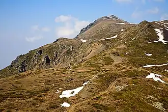 Tumba (Greek: Τούμπα, Bulgarian and Macedonian: Тумба) is a peak in the Belasica mountains in the region of Macedonia. The peak, 1,880 metres (6,170 ft) in height, lies on Belasica's main ridge, west of Lozen Peak and east of Sechena Skala Peak. A dome-shaped mountain with steep southern and northern slopes, Tumba is covered with low subalpine vegetation and is made of metamorphic rock. Tumba is notable as the point where the national borders of Bulgaria, Greece and North Macedonia meet (tripoint). It is one of the southwesternmost point of Bulgaria and one of the southeasternmost point of North Macedonia.